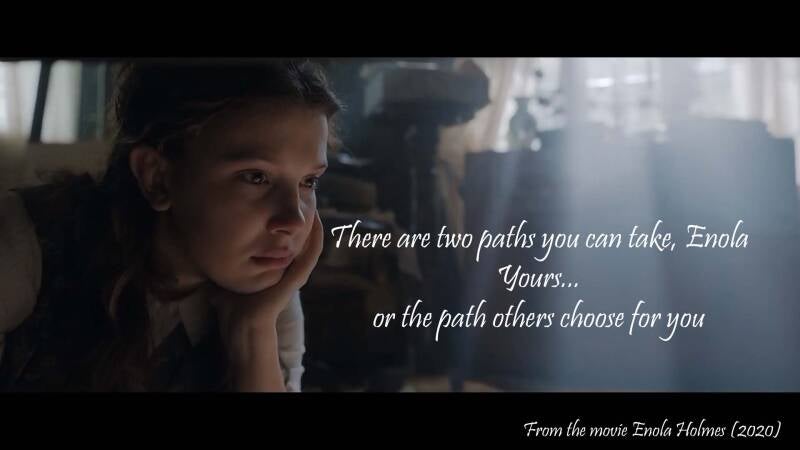 "You got that right, Ineke, I already have the film ready. But before I start it, let me just say that I'm glad we're all here together! And that movie, it's about detective Sherlock Holmes' sister. Her name is Enola and she is raised by her mother. However, her mother has a plan in mind for herself, which Enola doesn't know about. She only finds this out when her mother disappears, while Enola is not yet fully grown up by worldly standards. That Enola is, at its deepest level, fully mature, is revealed in the sequel of the film. Her mother has made a choice, chosen a path for her own life, because she knew what she had to do, both to Enola and to the world. And it turns out she has prepared her daughter well for something she has no idea about yet. Enola turns out to be a brave young lady, choosing a path against everything. She remembers, her mother once said: